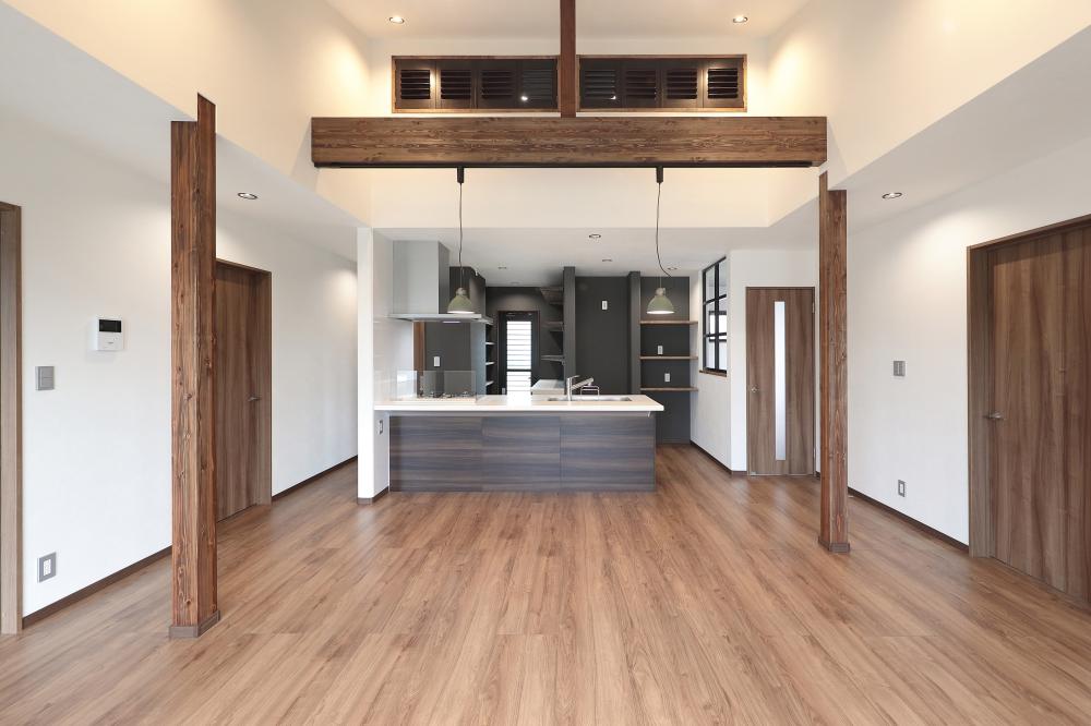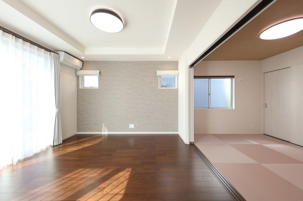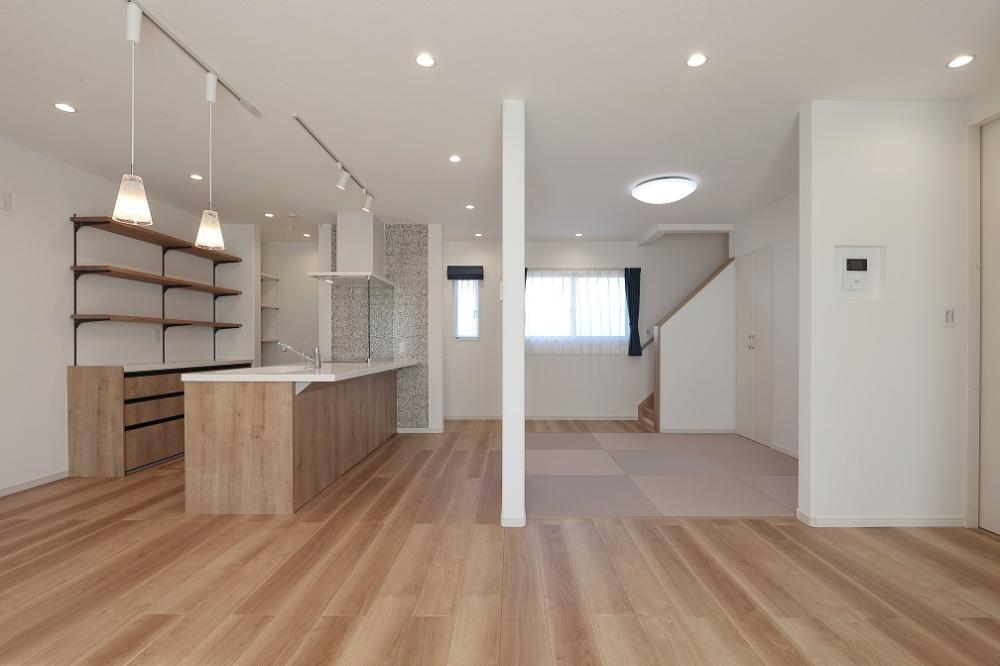 1階は水廻り以外をワンフロアとした広いLDK。キッチンは開放感のあるペニンシュラ型、4.5帖の畳スペースもあります。