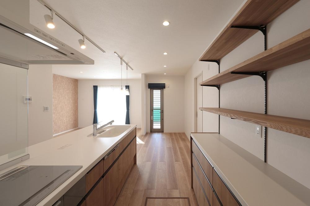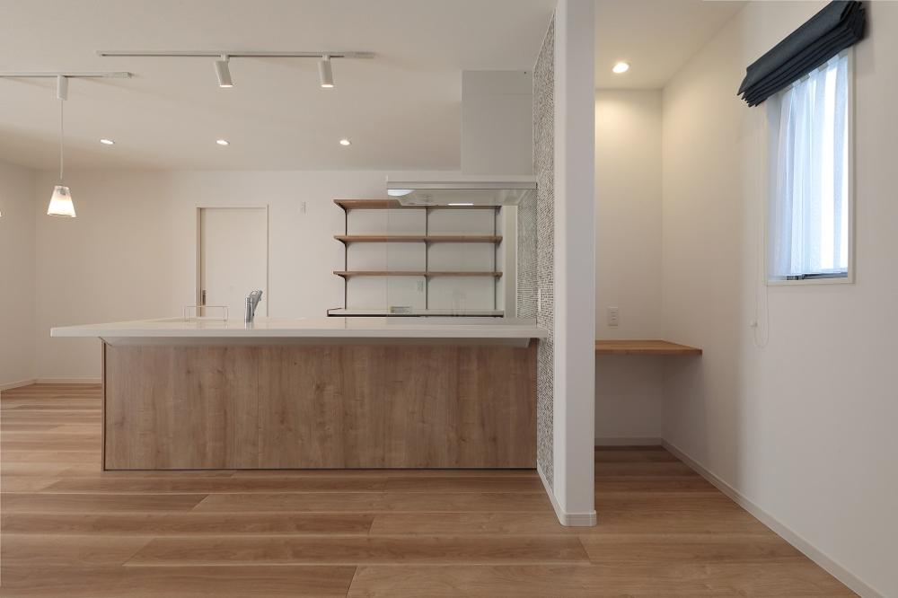 キッチン奥にはパントリーもあり、奥様がくつろぐ机カウンターも作りました。