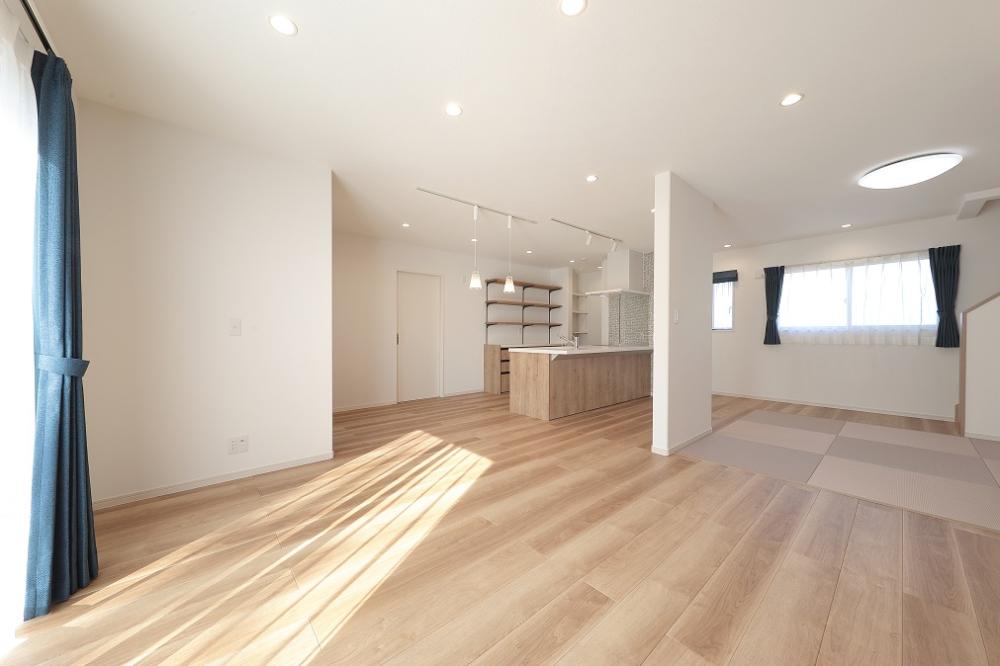 1階は水廻り以外をワンフロアとした広いLDK。キッチンは開放感のあるペニンシュラ型、 4.5帖の畳スペースもあります。