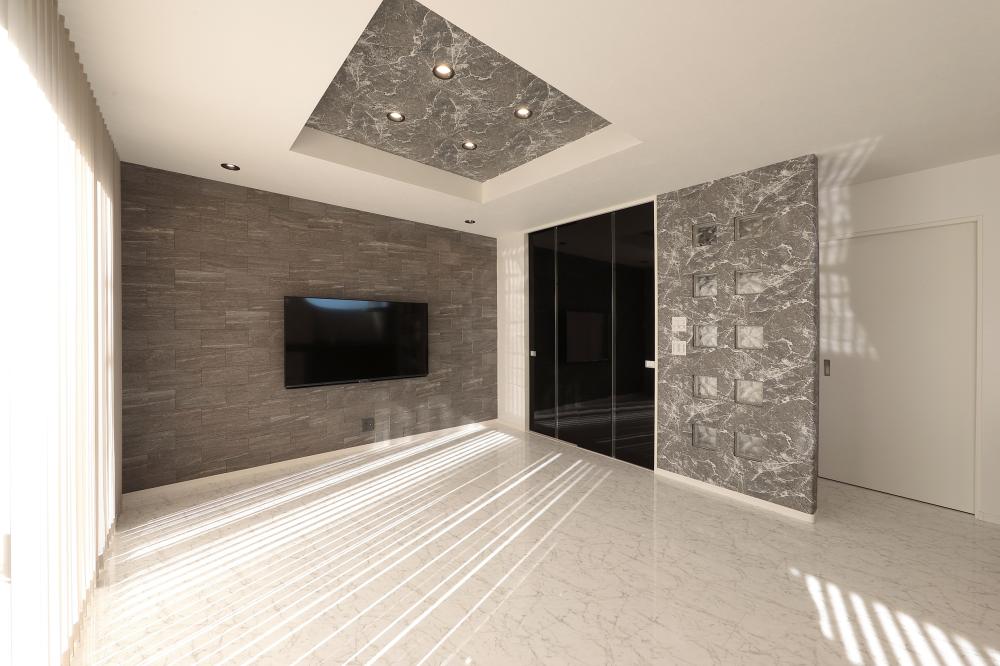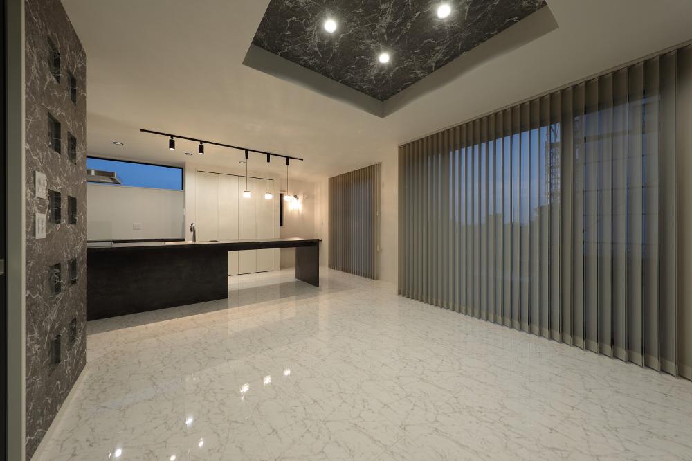 鏡面ブラックのハイドアを開けて入るLDKは、折上天井・ガラスブロックの壁・エコカラット・キッチンを黒系の色で統一。