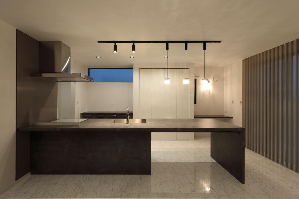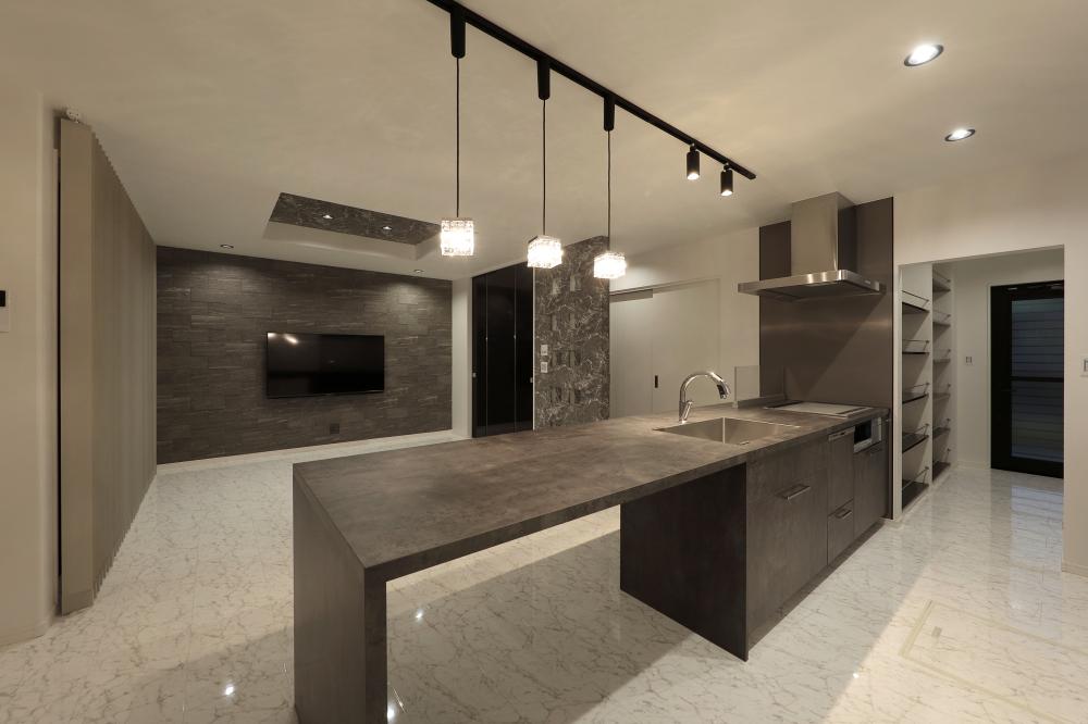 折上天井・ガラスブロックの壁・エコカラット・キッチンを黒系の色で統一。