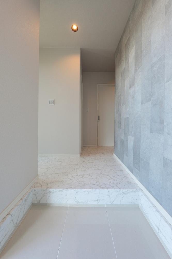 まるでリゾートホテル。玄関に入った瞬間、高級感のある石目柄のフローリングが目を引きます。
