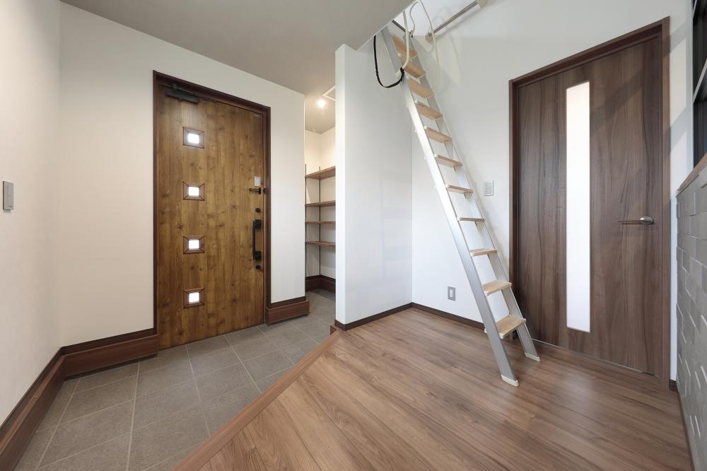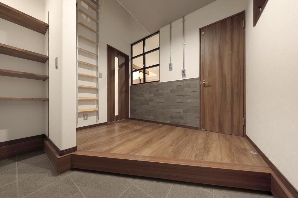 玄関を入ると、スイッチの配管を露出させ存在感を高めたタンブラスイッチ、スタイリッシュな室内FIX、ビンテージ感のあるエコカラットが出迎えてくれます。