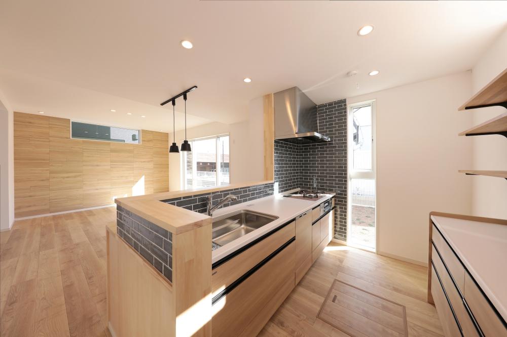 全体的に優しい色調のクロスや床材を使用したリビングの中で、キッチンと造作カウンターに施工したグレーのタイルが程よいアクセントに。