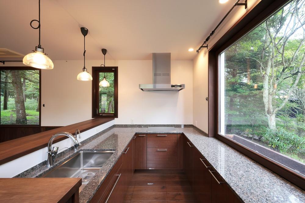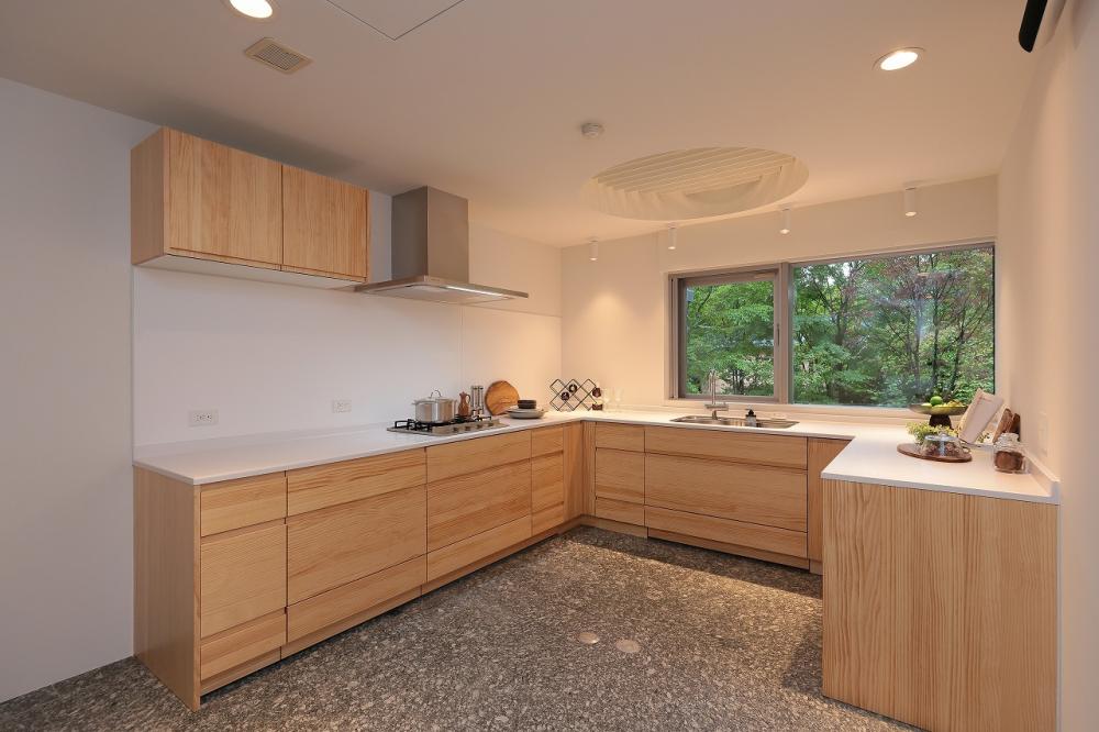 窓からの景色を眺めながら調理が楽しめる10.4帖のキッチン。広々とした作業スペース付き。
