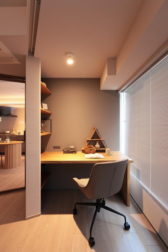 隣接する書斎はプライベートも確保出来るように間仕切りカーテンを設け、リモートワークや趣味の時間に最適