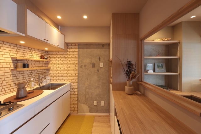 アクセントで平田タイルの【Casares/CASR-W】をキッチンタイルとして採用