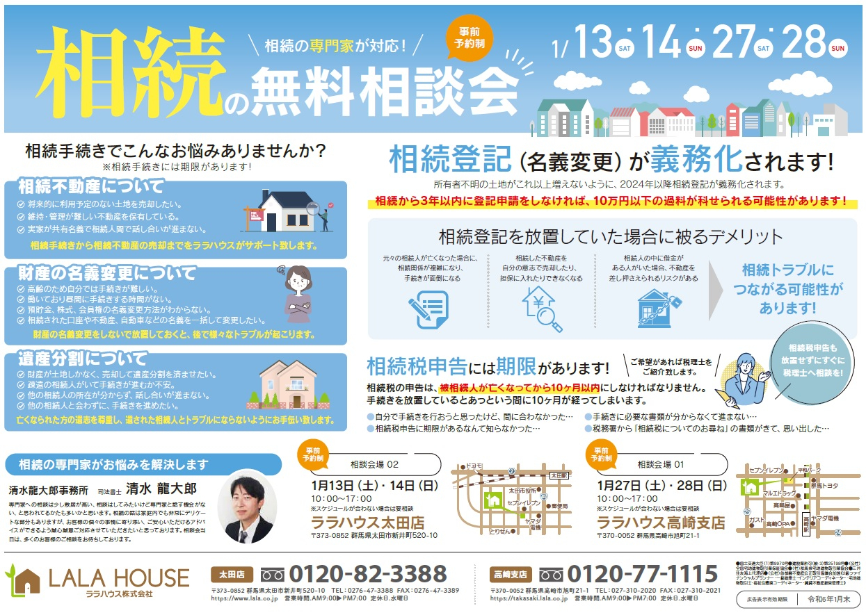 ララハウスでは太田店と高崎支店にて相続や不動産売却の相談ができる「相続相談会」を開催いたします!