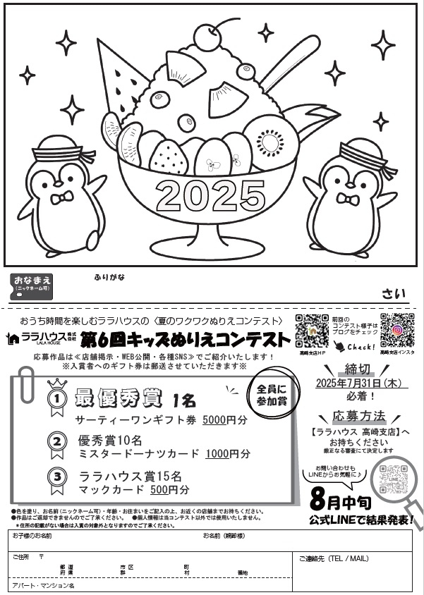 ララハウスからお子様対象のイベント「キッズぬりえコンテスト」開催のお知らせです!